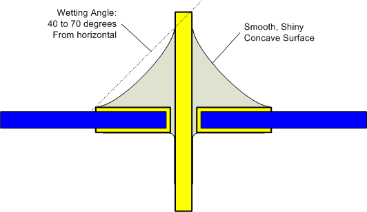 具有光滑表面和40-70度潤濕角的健康焊點。