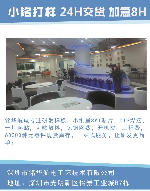 銘華航電是一家專業(yè)為電子行業(yè)創(chuàng)新型研發(fā)公司服務(wù)的平臺(tái),我們提供包括研發(fā)方案平臺(tái)、物料選型、樣板制作、小批量制作、檢測等服務(wù)內(nèi)容,提 升研發(fā)效益。
